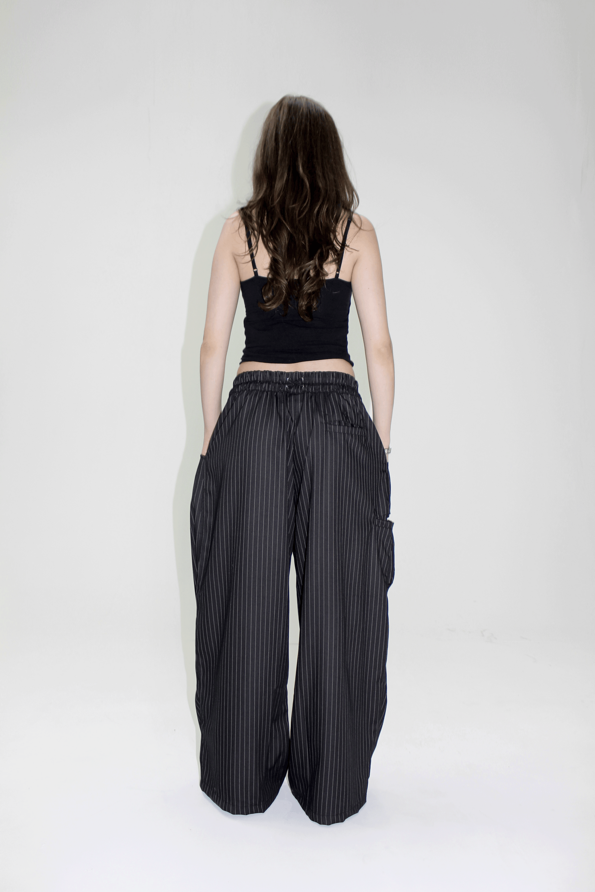 The Juno pants, crafted from a 100% cotton deadstock sourced from Korea, features a wide leg with front pleats and action pleats, front side pockets, and back and side flat felled pockets all with reinforced openings. The waistband is half elasticated, featuring a double cord locked adjuster that crosses at the back with all silver hardware.