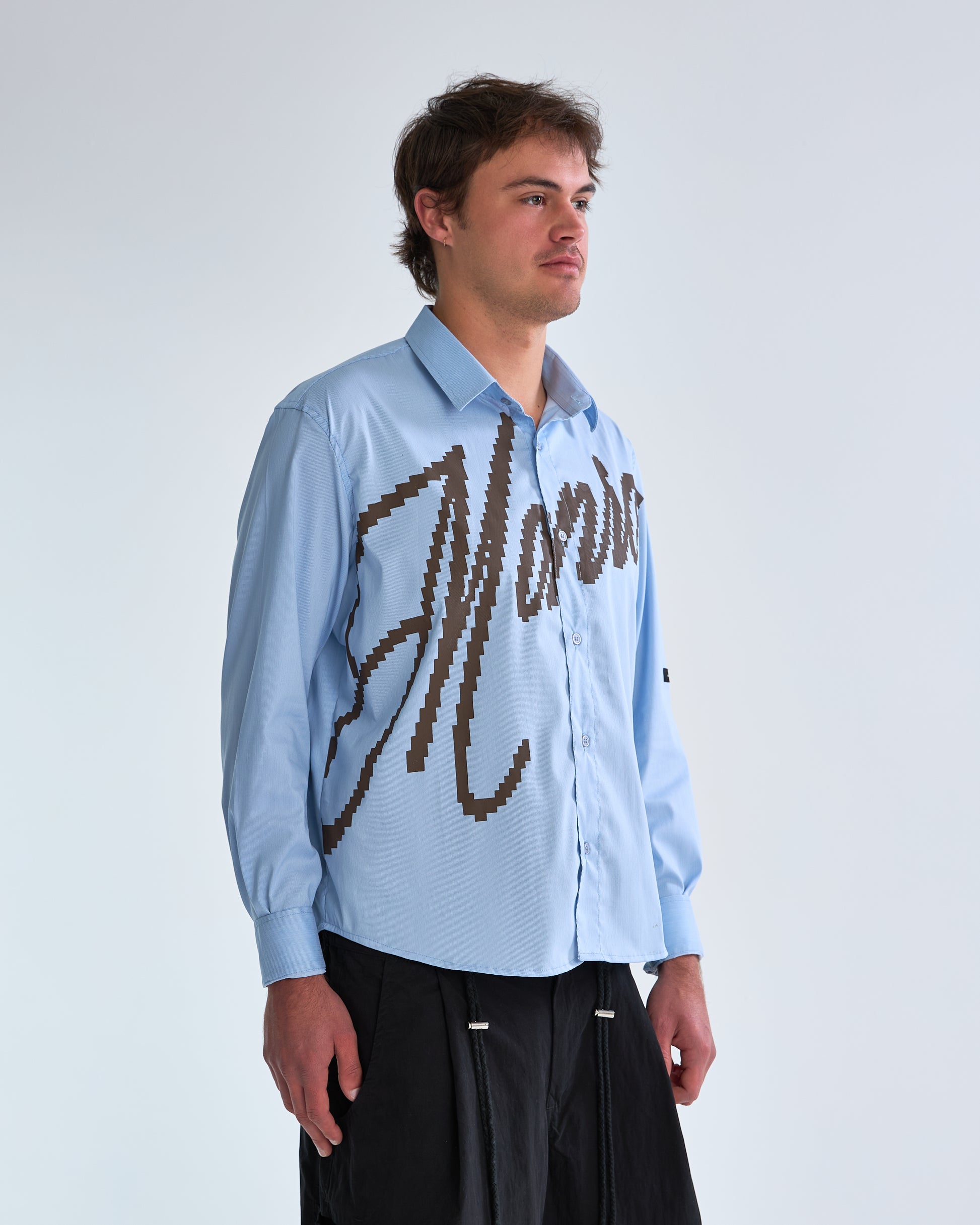 The Mon shirt, crafted from a smooth cotton, available in white or blue, features a cross body Monroe print detail from chest to sleeve. The shirt features a classic collar and double button cuff, as well as a slight curved hemline.